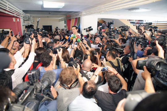 그리스의 운명을 가르는 국민투표가 5일 오후 7시(한국시간 6일 오전 1시) 끝났다. 국제통화기금(IMF) 등 국제 채권단의 채무 협상안을 받아들일 것인지 찬반을 묻는 투표 결과에 따라 그리스가 국가부도에 직면하는 대위기에 빠질 수 있다. 사전 여론 조사 결과, 찬성과 반대가 각각 42.5%, 43.0%로, 0.5%포인트 차이에 그쳤다. 찬성이면 치프라스 현 총리가 물러나고, 새로운 과도 정부가 국제채권단과 새로운 구제금융 협상을 이어갈 것이란 전망이 우세하다. 그러나 반대 결과가 나온다면 그리스 디폴트(채무불이행)와 그렉시트(유로존 탈퇴) 가능성을 배제할 수 없게 된다. 5일 오전 치프라스 총리가 투표 후 몰려든 취재진에 둘러싸여 있다.