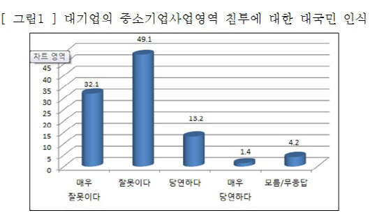 대기업이 영세소상공인과 중소기업의 사업영역까지 사업을 확장하는 것에 대해 응답자의 81.1%는 '잘못하고 있다'(매우잘못 32.1%, 잘못 49.1%)고 응답했다.