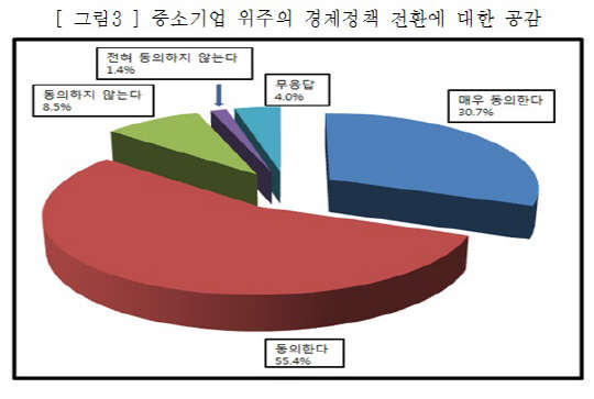 중소기업중앙회 '중소기업 적합업종 경쟁력 강화위원회'가 최근 20세 이상 일반국민 1000명을 대상으로 '적합업종 관련 대국민 인식조사'를 실시해 15일 내놓은 결과에 따르면 응답자의 86.1%는 경제정책이 대기업 위주에서 중소기업 위주로 전환돼야 한다는 주장에 '동의'한 것으로 집계됐다.