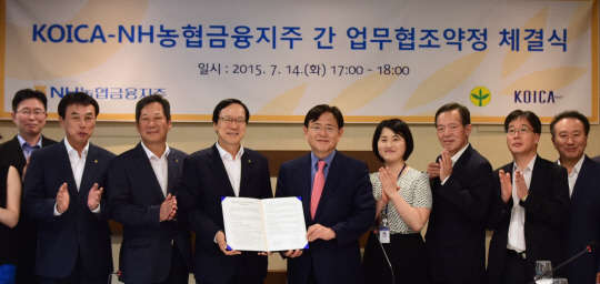 NH농협금융지주는 한국국제협력단(KOICA)와 14일 경기도 성남 KOICA 개발협력역사관에서 상호 관련 사업 분야에서의 협력을 강화하기 위한 업무협약(MOU)을 체결했다고 15일 밝혔다. 이번 협약으로 두 기관은 개발도상국을 대상으로 농촌지역 개발협력을 위한 농업금융 관련 사업, 농업 관련 인프라 구축을 위한 프로젝트 파이낸싱, 협동조합금융 등에 대한 자문 및 발전 지원 등에 협력하기로 했다. 김용환 NH농협금융지주 회장(왼쪽 두번째)과 김영목 한국국제협력단 이사장(세번째)이 MOU를 체결한 후 기념촬영을 하고 있다.