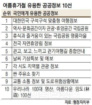 15일 행정자치부는 기관별로 제공되는 공공정보 중 여름 휴가에 도움되는 정보를 온라인 국민투표를 거쳐 '여름 휴가철에 유용한 공공정보 10선'을 선정했다고 밝혔다. 선정된 공공정보는 중앙행정기관, 시도·시군구, 공공기관에서 선제적으로 제공하는 사전정보공표 정보를 추천 받아 정보공개포털을 통한 대국민 선호도 투표(7.1∼7.7, 1019명 참여)를 거쳐 발표되는 것이다.
