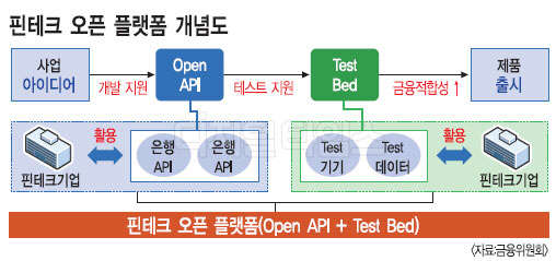 오픈 플랫폼은 금융회사 내부의 금융 서비스를 표준화된 규격으로 제공하는 오픈 API와 개발된 금융서비스를 전산망에서 시험해볼 수 있는 테스트베드(Test-bed)가 더해진 개념이다. 은행권 API는 금결원이, 금투업 API는 코스콤이 주관이 돼 각각 포털형태로 구축하며 향후 핀테크 기업이 기술규격을 내려받아 서비스 개발에 활용할 수 있다.