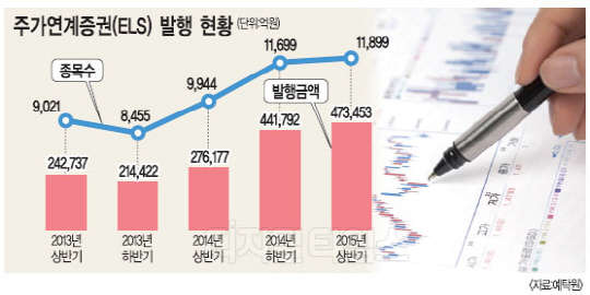올해 상반기 파생결합사채(ELB)를 포함한 ELS 발행액은 47조3453억원으로, 지난해 상반기(27조6177억원)보다 71.4% 증가했다. 이는 지난 2012년과 2013년의 연간 발행 규모를 웃도는 수준이다. 또 ELS 발행액은 지난해 말 기준 71조7969억원을 기록, 국내외 주식형펀드 순자산총액인 73조원에 근접했다. 지난해 상반기 기준으로는 예금, 보험, 연금 등 금융투자상품 전체의 0.9%를 차지, 7년 연속 비중을 늘려오고 있다. 올해 저금리, 저성장이 지속하면서 ELS 발행금액은 역대 최고 수준으로 증가할 것으로 전망된다.