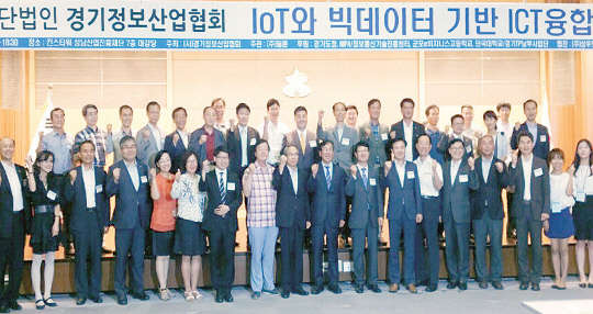 경기정보산업협회(회장 양재수 단국대 교수)는 지난 14일 성남시 정자동 성남산업진흥재단에서 'IoT와 빅데이터 기반 ICT융합 세미나'를 열었다. 이계형 단국대 부총장(왼쪽 아홉번째부터), 이상홍 정보통신기술진흥센터장, 양재수 경기정보산업협회장 등 참가자들이 기념촬영을 하고 있다.