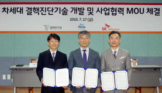 SK텔레콤은 지난 17일 충청북도 오송의 결핵연구원에서 체외진단기기 전문업체 나노엔텍의 자회사 바이오포커스(대표 서정구), 대한결핵협회 결핵연구원과 차세대 결핵진단기술 개발과 사업협력을 위한 상호양해각서(MoU)를 체결했다고 밝혔다. (왼쪽부터) 서정구 바이오포커스 대표, 김희진 결핵연구원 원장, 김명립 SK텔레콤 체외진단사업본부장이 MOU를 맺고 기념 촬영을 하고 있다.