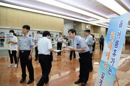 행정자치부 공무원들이 20일 서울 종로구 정부서울청사에서 '여름휴가 국내로 가기 및 에너지절약 캠페인'을 펼치고 있다.