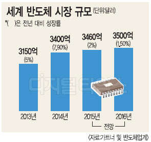 반면 D램 시장은 공급과잉 국면이 뚜렷하다. 시장조사업체 가트너는 2015년부터 2016년까지 세계 반도체 매출성장률이 감소세에 접어들 것으로 전망했다. 반도체 시장은 올해 2.2% 성장한 이후 내년에는 1.3% 수준의 성장률을 기록할 것으로 보인다.