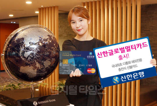 이 카드는 미국 달러, 일본 엔화, 유로화, 영국 파운드화, 호주 달러, 뉴질랜드 달러, 캐나다 달러, 홍콩 달러, 싱가포르 달러, 스위스 프랑 등으로 충전할 수 있다. 1회 최소 미화 50달러부터 최대 1만달러, 연간 10만달러까지 충전이 가능한 신한글로벌멀티카드는 기존의 신용카드나 체크카드와는 달리 해외카드사용 수수료가 부과되지 않으며 전 세계 마스터카드 네트워크를 이용해 물품 구매는 물론 해외 금융자동화기기(ATM)에서의 현찰인출도 가능하다.