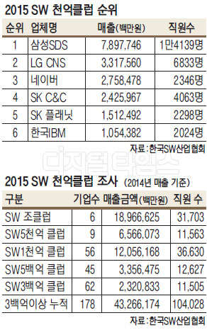 '2015 SW천억클럽' 발표 300억 이상 기업은 178개로 증가… 매출은 줄어 SW산업 관심·기대 커져 직원수는 꾸준히 늘어