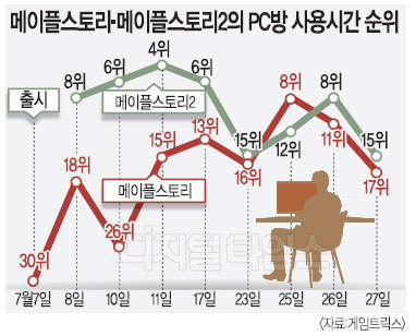 지난 25일, '메이플스토리', '메이플스토리 2'의 PC방 순위가 각각 8위(PC방당 사용시간 893분), 12위(779분)로 집계된 것.