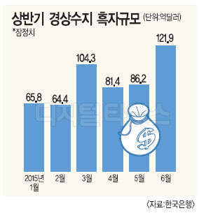 이로써 올 상반기 경상수지 흑자 규모는 523억9000만달러로 지난해 같은 기간보다 129억6000만달러(32.9%) 증가했다. 경상수지는 2012년 3월부터 올 6월까지 40개월 연속 흑자를 이어오고 있다. 1986년 6월부터 38개월간 이어졌던 기존의 최장 흑자기간을 넘어선 기록이다.