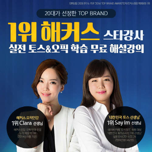 한편해커스어학원은 지난해 11월 21일 대학내일 20대 연구소에서 발표한 '2014년 20대 TOP BRAND AWARDS-토익/토익스피킹 학원 분야 1위'에 선정됐다.