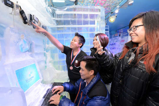 메르스 사태가 종식 국면으로 접어들면서 한국을 찾는 외국인 여행객 수가 예년 수준을 회복하면서 관광업계가 다시 활기를 찾고 있다.전국 대부분의 지역에 '폭염특보'가 내려진 9일 서울 종로구 화동에 위치한 아이스갤러리를 찾은 중국관광객들이 구형 휴대폰과 컴퓨터를 주제로 만든 얼음조각을 보며 더위를 잊고 있다.