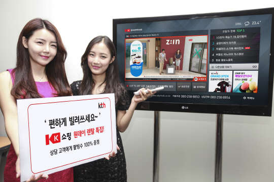 KTH(대표 오세영)는 디지털홈쇼핑(T커머스) 'K쇼핑'에서 렌탈 소비 급증 추세에 발맞춰 9일 하루 동안 '가정용품 렌탈 특집'을 진행했다고 밝혔다. 회사는 정수기, 비데, 안마의자, 렌터카, 상조 등 다양한 렌탈 상품을 선보였다. KT경제경영연구소에 따르면, 소비재 렌탈시장 규모는 지난 2011년 12조2000억원에서 2016년 16조9000억원까지 38% 가량 급성장할 것으로 예상된다. 회사 모델이 K쇼핑 가정용품 렌탈 특집전을 알리고 있다.