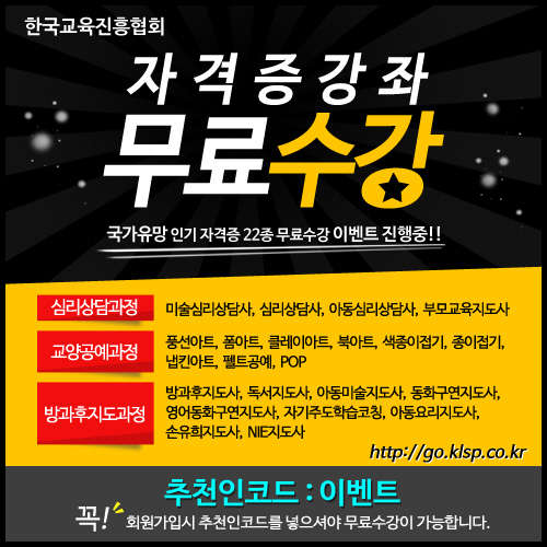 한편 무료자격증 수강 혜택 참여 방법은 한국교육진흥협회 자격증사이트에 (http://go.klsp.co.kr) 회원가입 시 추천인코드에 '이벤트'를 입력하면 바로 무료수강등록 및 수업듣기가 가능하다.