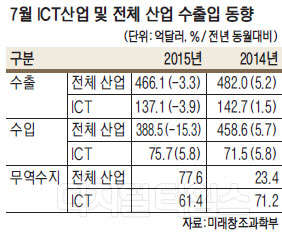 미래창조과학부는 7월 ICT 수출액이 지난해보다 3.9% 줄어든 137억1000만 달러, 수입은 5.8% 증가한 75억7000만 달러를 기록했다고 밝혔다. 이에 따라 ICT 무역수지는 61억4000만 달러 흑자를 기록했다. 미래부는 주요 선진국과 비교할 때 한국의 ICT 수출은 선방하고 있지만, ICT 교역 둔화와 성장률 전망치 하락 등 대외 여건 악화가 지속되고 있다고 설명했다.