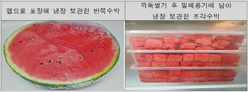 소비자원은 "일반 가정에서는 하나의 칼, 도마로 음식을 조리하고 냉장고 문을 수시로 열어 세균오염에 더 쉽게 노출될 수 있다"면서 "수박을 먹을 때는 가급적 당일에 먹고 남은 부분은 작게 잘라 밀폐용기에 보관하는 게 좋다"고 조언했다.