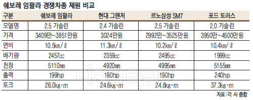 아울러 현재 국산 준대형차는 수입차의 공세에 밀린 상황이어서, 임팔라가 국산 경쟁차종은 물론 수입차들의 대항마의 역할까지 해낼 수 있을지에 관해서도 관심이 집중된다.