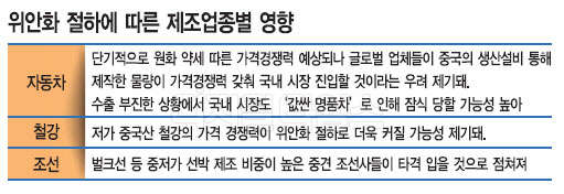 엔저에 위안화 쇼크까지 중 연내 추가절하 가능성 '중국산 폭스바겐' 유입땐 수출부진 내수타격 뻔해 철강 조선 IT 등도 타격