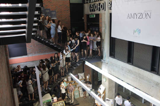29일 아이웨딩 서울 본사에서 열린 에이미존의 첫 '패밀리세일' 론칭 기념 행사에 5천여명이 넘는 예비 신혼부부가 몰려 마치 콘서트장을 방불케 하는 구름인파로 북새통을 이뤘다.
