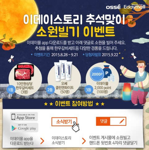 이번 이데이몰 추석맞이 빅 이벤트의 응모 방법은 간단하다. 먼저 이데이스토리 이벤트 페이지의 링크를 클릭하여 리뉴얼된 '이데이몰 모바일 앱'을 다운로드 받고, '이데이스토리 소식받기(구독하기)'를 클릭하면 된다. 이 이벤트 게시글을 다른 친구들과 공유하면 당첨 확률은 더욱 높아진다.