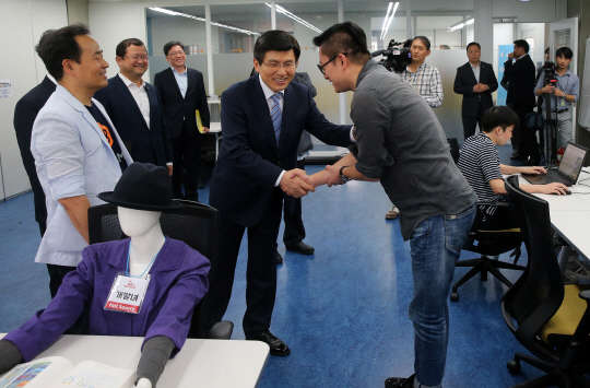 황교안 국무총리가 2일 오후 서울 강남구 역삼동 D-캠프에 입주한 한 업체를 방문해 직원들을 격려하고 있다. D-캠프는 벤처창업 지원을 위하여 은행권청년창업재단에서 2013년 설립했으며 창업기업 입주공간과 교육·세미나 시설 등을 제공한다. D-캠프에는 현재 30여개의 벤처기업이 입주해 있다.