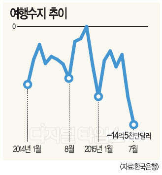 특히 메르스 여파를 맞은 여행수지의 감소 폭이 두드러졌다. 여행수지는 14억5000만달러 적자를 내 2008년 7월(16억5000만달러 적자) 이후 적자 규모가 가장 컸다. 여행수지 적자는 5월 4억1000만달러 수준이었지만, 메르스가 본격적으로 확산된 6월에는 10억4000만달러로 나빠졌고, 7월 들어서는 적자 폭이 확대됐다. 여행수지 적자의 확대는 내국인이 국외에서 사용한 돈이 외국인 관광객과 유학생이 국내에서 지출한 돈보다 늘었다는 뜻이다.