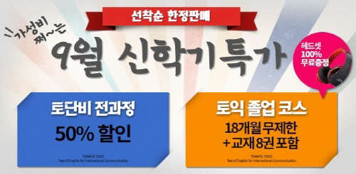 9월 신학기 특가로 '토단비 전과정' 중에 한가지를 선택해 수강할 경우 선착순으로 수강료의 50%를 할인해주며, '토익졸업코스'는 전 강좌를 18개월 동안 무제한으로 들을 수 있고 교재 8권을 제공해준다. 이에 더해 블루투스 헤드셋을 100% 무료로 얻을 수 있다. 토클 프리패스는 122만원 상당의 단과강좌를 무제한으로 들을 수 있다.