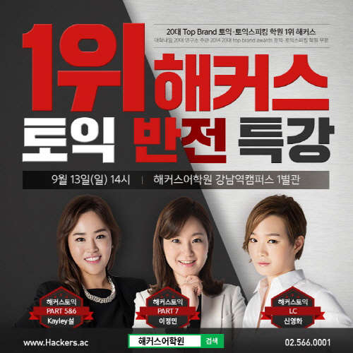 한편 해커스 강남 토익특강은 지난 해 11월부터 6개월 연속으로 정기토익 문제를 적중해 왔으며, 특강 만족도 최고 99.7%(3월 프리미엄 토익특강 만족도 설문조사/280명, 2015.3.22)를 기록한 인기 특강이다. 해커스 스타강사들의 토익강의를 무료로 들을 수 있을 뿐만 아니라 다양한 혜택도 받을 수 있어 신청을 서두르는 학생들이 많을 것으로 예상된다. 토익 시험 하루 전인 19일(토)에는 종로 토익 빡센특강이 진행될 예정이다.