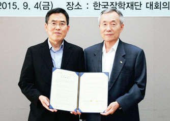 유길상 한국고용정보원장(왼쪽)과 곽병선 한국장학재단이사장이 4일 서울 남대문로 연세빌딩 한국장학재단 대회의실에서 '장학생 취업역량강화와 우수인재 양성'을 위한 업무협약을 맺고 있다.