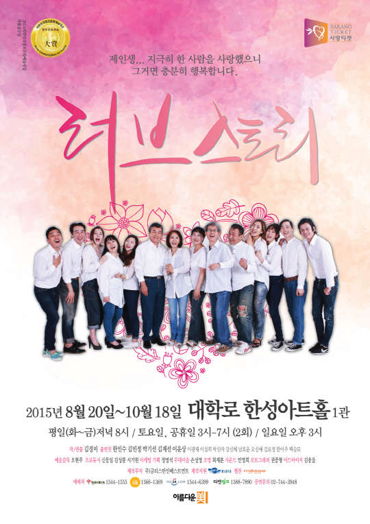 연극 '2015 러브스토리'는 10월 18일까지 대학로 한성아트홀(1관)에서 열리며, R석 5만원, S석은 3만원이다. 인터파크를 통해 문화체육관광부 지원의 1+1 티켓을 이용하면 반 값의 가격으로 공연관람이 가능하다.