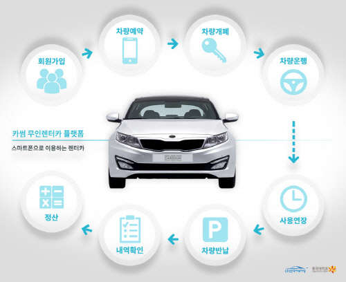 가입 회원들에게 근처의 렌터카를 가장 편리하게 예약하고 사용할 수 있도록 모바일 앱을 통해 One-stop 서비스를 제공해 주는 ㈜한국카쉐어링의 렌터카 서비스 플랫폼 '카썸'이 바로 그 주인공이다.