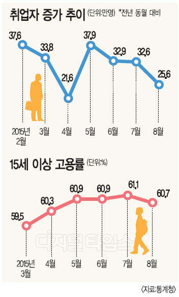 9일 통계청이 발표한 '8월 고용동향' 통계자료를 보면 8월 취업자 수는 2614만1000명으로 지난해 같은 달보다 25만6000명이 증가했다. 이는 매년 8월을 기준으로 2009년 8월 이후 가장 낮은 증가세다.