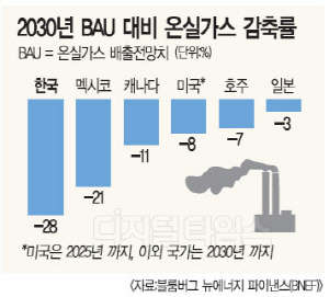 BNEF는 나라마다 다른 조건을 고려해 나라별로 온실가스 배출전망치(BAU)와 감축 비율을 직접 비교해 산정했다. 이 경우 한국은 2030년까지 감축비율이 28%에 이르고, 반대로 미국의 경우 8%만 감축한다는 것이 BNEF의 설명이다. EU와 중국, 러시아의 목표 배출량의 경우 오히려 전망치보다 증가한다.