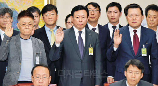 신동빈 롯데그룹 회장(앞줄 가운데)이 17일 국회에서 열린 국회 정무위원회의 공정거래위원회 등에 대한 국정감사에 출석해 증인선서를 하고 있다. 신 회장은 "제2차 형제의 난, 경영권 분쟁의 소지가 있느냐"는 질문에 "그런 가능성은 없다"고 답했다.