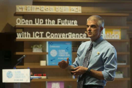 대교문화재단은 17일 서울 신대방동 대교타워에서 '2015글로벌교육포럼'을 개최했다. 이 포럼은 국내외 교육전문가들이 한 자리에 모여 한국 교육의 미래에 대해 논의하고 발전방향을 제시하는 국제행사다. 플립러닝 모델을 교실에 도입한 존 버그만(Jon Bergmann) 플립클래스닷컴 교육책임자가 기조연설을 하고 있다.