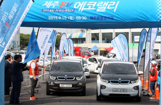 19일 오전 제2회 제주 전기차 에코 랠리 참가자들이 제주종합경기장에서 출발하고 있다. 이번 대회에는 국내에서 판매하는 6개 차종 35대(70명)이 참가해 에코 드라이빙 기술을 겨룬다.