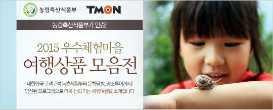 티켓몬스터(대표 신현성)가 운영하는 소셜커머스 티몬(www.tmon.co.kr)은 농림축산식품부와 손잡고 국내 농촌의 소득증대를 위한 '우수체험마을 여행상품 기획전'(사진)을 11월까지 진행한다고 24일 밝혔다.