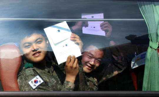 육군 7사단 병사들이 24일 강원 화천터미널에서 고향으로 가는 버스에 탑승해 특별 휴가증을 내보이고 있다. 박근혜 대통령은 추석을 맞아 부사관 이하 모든 국군 장병에게 1박2일의 특별 휴가증 수여했다.