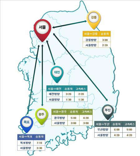 오후 9시 승용차 출발을 기준으로 서울에서 전국 주요 도시까지 걸리는 예상 시간은 목포 7시간10분, 부산 6시간, 광주 5시간40분, 대전 3시간20분, 강릉 3시간 등이다.