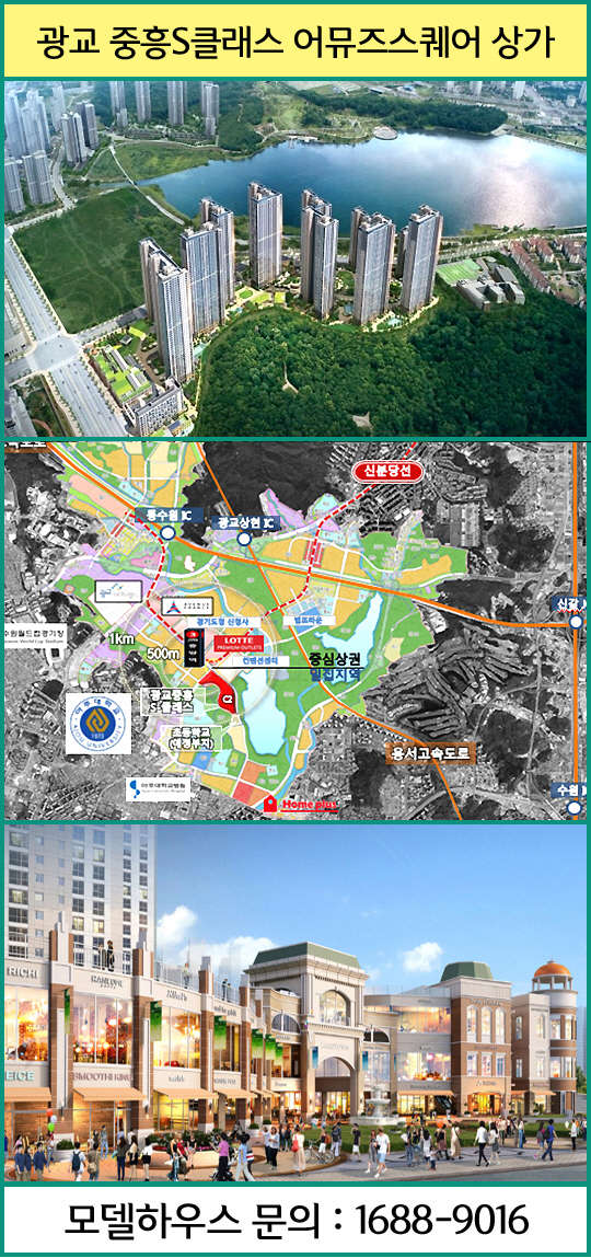 아파트와 오피스텔의 인기에 이어 상업시설인 '광교 중흥S클래스 어뮤즈스퀘어'도 광교 호수공원 바로 앞이라는 최고의 입지조건으로 경쟁이 치열하게 전개될 것으로 예상되고 있다.