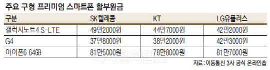 29일 업계에 따르면 이동통신 3사는 10월 스마트폰 신제품 출시를 계기로 삼성 갤럭시노트4, LG G4 등 구형 제품 가격을 40만~50만원 대로 낮추고 있다.