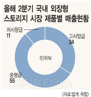 29일 시장조사업체 IDC에 따르면, 올해 2분기 국내 외장형 스토리지 시장에서 중형급 부문은 전체의 55%를 차지한 656억원을 기록했다. 이 영역은 지난해 같은 기간과 비교해 20%나 성장했는데, 고사양급과 저사양급 부문이 각각 3%, -18% 등으로 비슷한 수준을 유지하거나 대폭 하락한 것과 비교해 사실상 전체 시장 성장을 이끌고 있다.