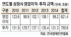 국내 상장사의 영업이익은 2010년 123조6000억원을 기록한 뒤 2014년 99조2000억원으로 감소했다. 투자액도 2010년 131조9000억원을 기록한 뒤 소폭 증·감을 거듭하면서 2014년 131조3000억원으로 늘어나지 못하고 있었다.