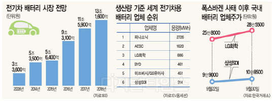 특히 이날에는 LG화학이 전날보다 5%, 삼성SDI가 전날보다 3% 이상 주가가 올랐다. 폭스바겐의 배출가스 조작 파문이 알려지기 직전인 지난달 22일과 비교하면 양쪽 모두 9% 이상 늘어난 숫자다.
