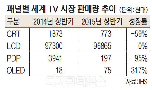 지난달 30일 시장조사업체 IHS에 따르면 OLED TV는 올해 상반기 7만5600대의 판매고를 기록하며 지난해 상반기(1만8100대)보다 317% 성장했다. 같은 기간 액정표시장치(LCD) TV는 9686만대로 지난해보다 판매량이 소폭 감소했다. 브라운관(CRT) TV와 플라즈마디스플레이패널(PDP) TV는 각각 59%, 95% 수준의 하락세를 기록했다.
