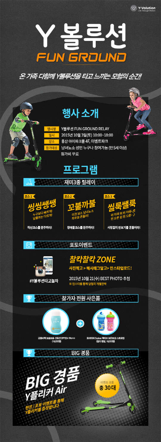 10월 3일 오전 10시부터 오후 6시까지 용산 아이파크몰 4층 이벤트 파크에서 진행되는 Y볼루션 '펀 그라운드'는 승용완구 체험행사로 소비자들이 승용완구를 안전하고 바르게 탈 수 있는 교육세션 및 다채로운 이벤트를 진행한다. 만 5세 이상이면 남녀노소 누구나 참여 가능하다.