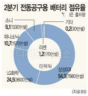 5일 시장조사업체 B3에 따르면 삼성SDI는 지난 2분기 전동공구용 배터리 7980만셀을 생산해 출하량 기준으로 시장점유율 54.3%를 차지했다. 이는 2위인 LG화학(3600만셀, 점유율 24.5%)과 비교하면 2배 이상의 격차다.