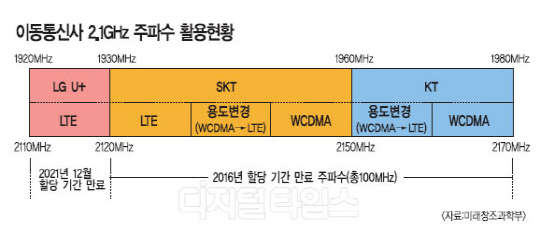 내년 12월에는 2.1㎓ 전체 120㎒ 폭 통신용 주파수 중 100㎒ 폭의 할당기간이 끝난다. SK텔레콤이 보유한 60㎒ 폭과 KT가 보유한 40㎒ 폭이다. 이는 원래 두 이통사가 3G 용도로 쓰기로 하고 정부로부터 임대한 것이다. 하지만 지난해 미래창조과학부가 트래픽 폭증을 고려해 3G 주파수의 LTE 전환을 허용하자, 두 이통사 모두 20㎒ 폭만 3G용으로 남기고 모두 LTE로 용도를 바꿔 쓰고 있다.