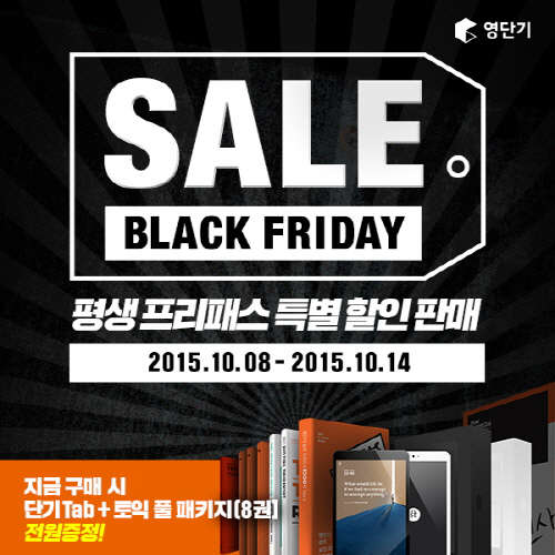 또, 7일간의 특별 할인판매 기간인 블랙프라이데이에 '전강좌 평생 프리패스'를 구매하고 3만 7천원만 추가로 지불하면 교육용 태블릿pc 단기탭 32G를 추가로 증정한다. 또한 1444명의 단기 고득점 비법인 토익 단기 졸업 풀패키지 8권을 100% 전원에게 제공하며 카카오톡 바른생활 이모티콘도 무료로 증정한다.